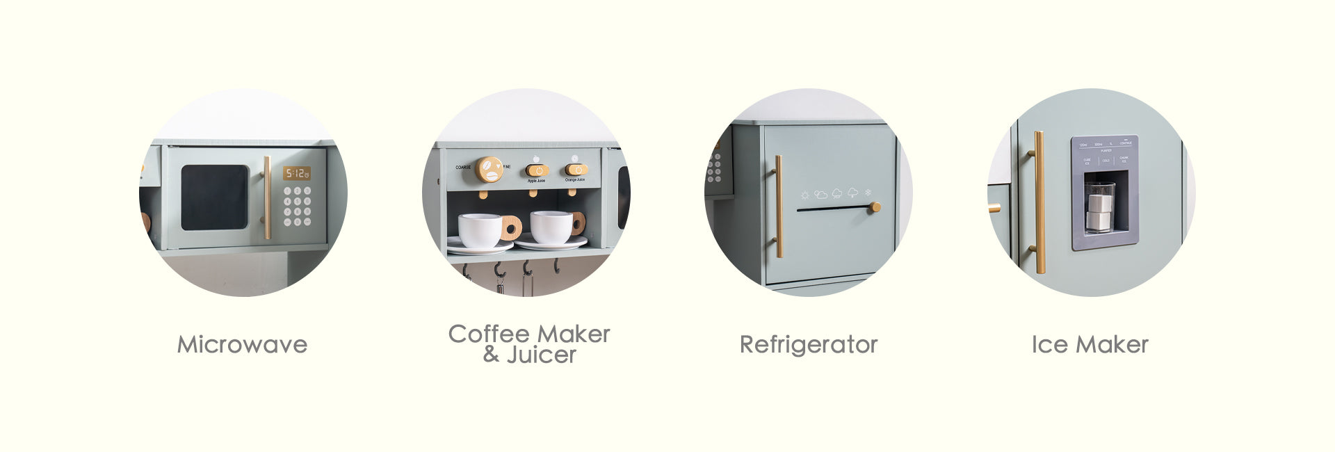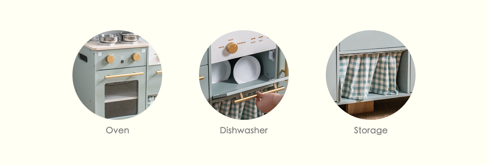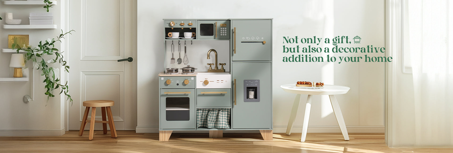 Der sanfte Grünton verleiht jedem Spielzimmer eine beruhigende, moderne Atmosphäre, während die robuste Holzkonstruktion für langanhaltenden Spielspaß sorgt. Mit interaktiven Funktionen und verkleinerten Proportionen ist es die perfekte Einrichtung für junge Köche, um zu entdecken, sich etwas auszudenken und sich durch kreative Kochgeschichten auszudrücken.