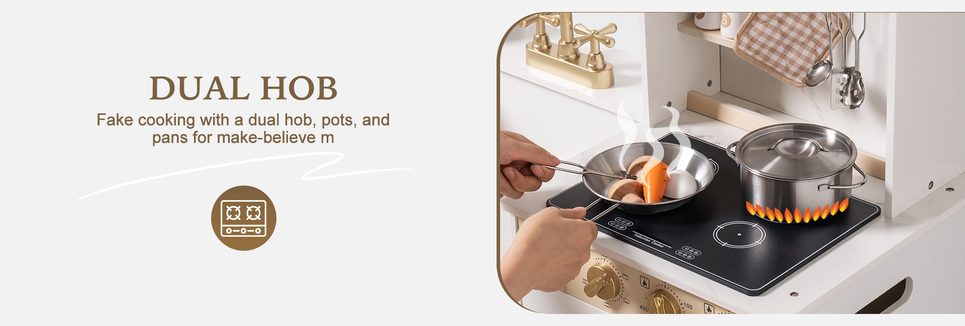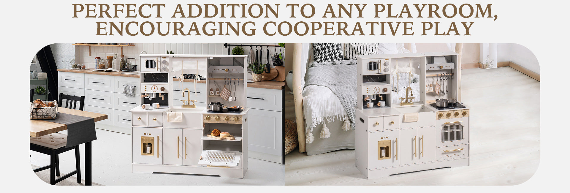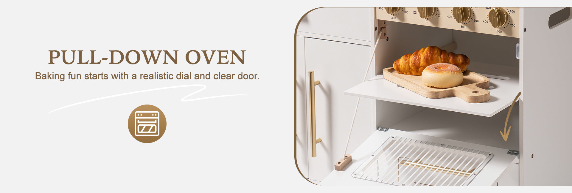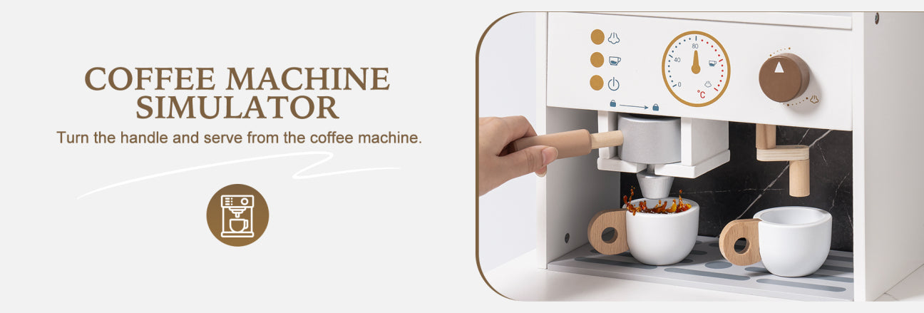 Ausgestattet mit einem ausziehbaren Backofen, einem Doppelkochfeld, einem drehbaren goldenen Wasserhahn und einem Kaffeemaschinen-Simulator, erweckt dieses Spielset den Spielspaß einer echten Küche zum Leben. Kinder können Knöpfe drehen, Backofentüren öffnen und Kaffee „brühen“ und so ihre Feinmotorik, Hand-Augen-Koordination und soziale Interaktion fördern.