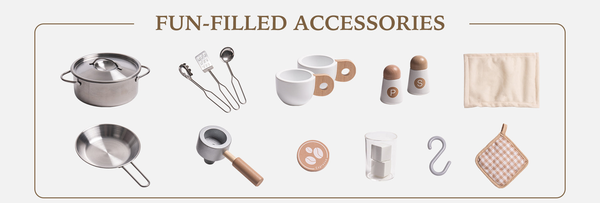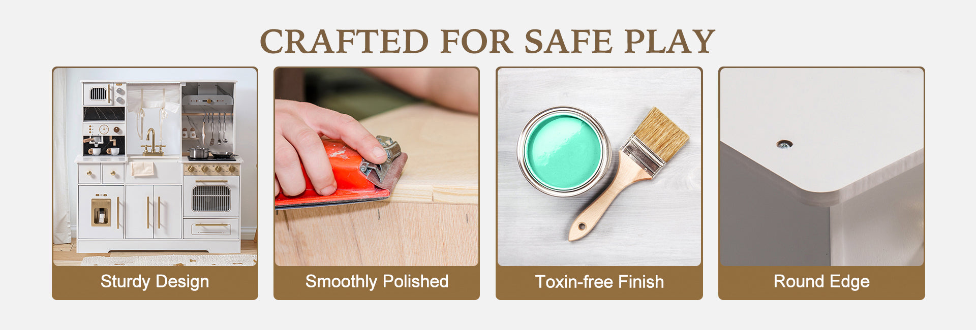 Gefertigt aus hochwertigen Holzmaterialien, ist die Oberfläche glatt und frei von scharfen Kanten. Ungiftige Farbe und abgerundete Ecken sorgen für sicheres Spielen im Alltag. Die robuste Konstruktion hält jahrelangen, fantasievollen Kochabenteuern stand.