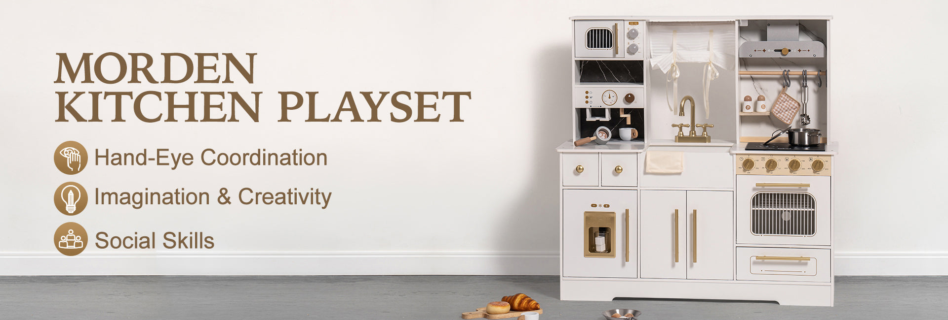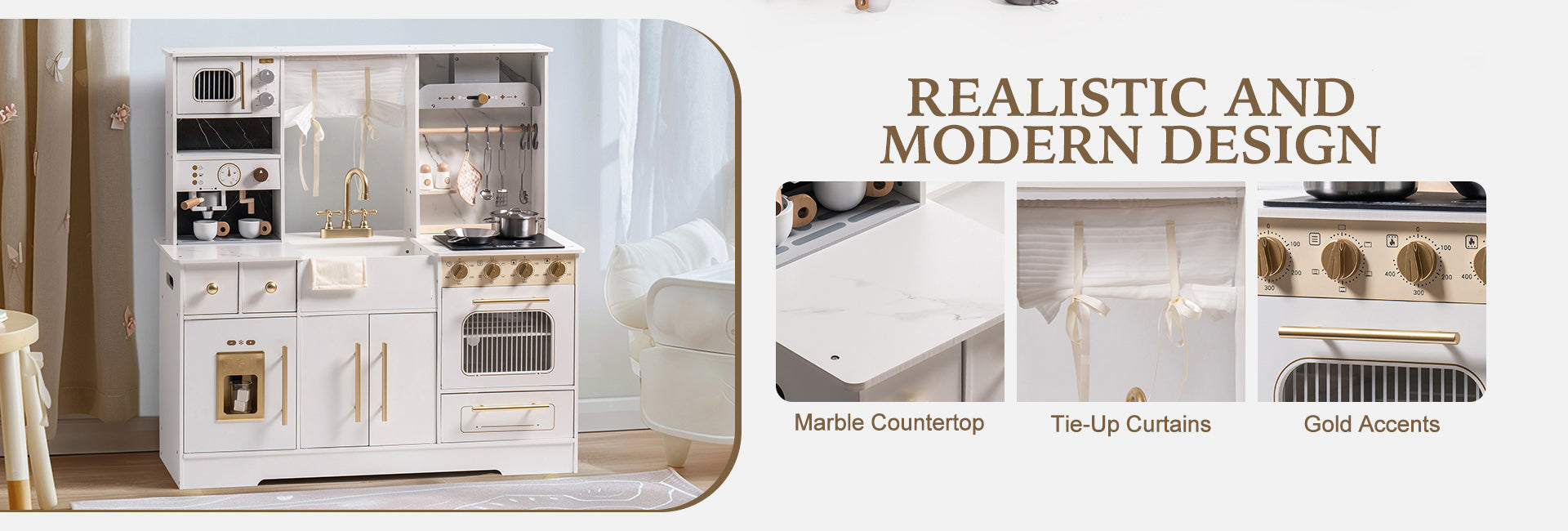 Verwandeln Sie die Spielzeit in eine Welt der Fantasie mit dieser modernen Spielküche aus Holz, erhältlich in zwei eleganten Ausführungen – Weiß & Gold und Schwarz & Gold. Sie wurde sorgfältig für Kinder ab 3 Jahren entworfen und vereint Raffinesse mit Funktionalität. Durch realistische Rollenspiele fördert sie Kreativität, Kooperation und Selbstvertrauen.
