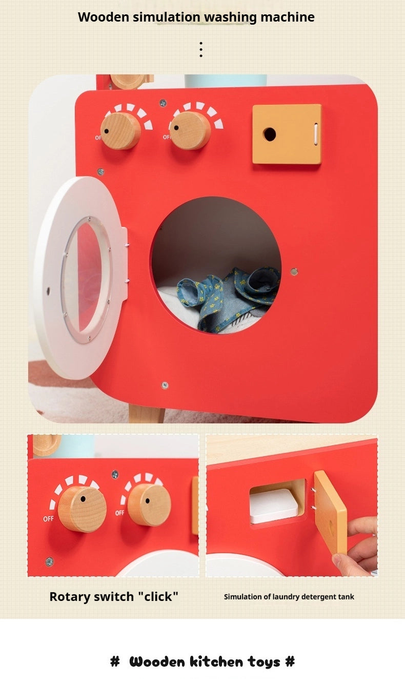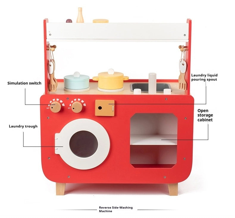 Dieses rote, beidseitige Holz-Spielküchen-Set bringt das fantasievolle Rollenspiel auf ein ganz neues Level. Mit einem realistischen Ofen, einer Waschmaschine und interaktiven Bedienelementen können zwei Kinder gleichzeitig spielen – kochen auf der einen Seite und Wäsche waschen auf der anderen!