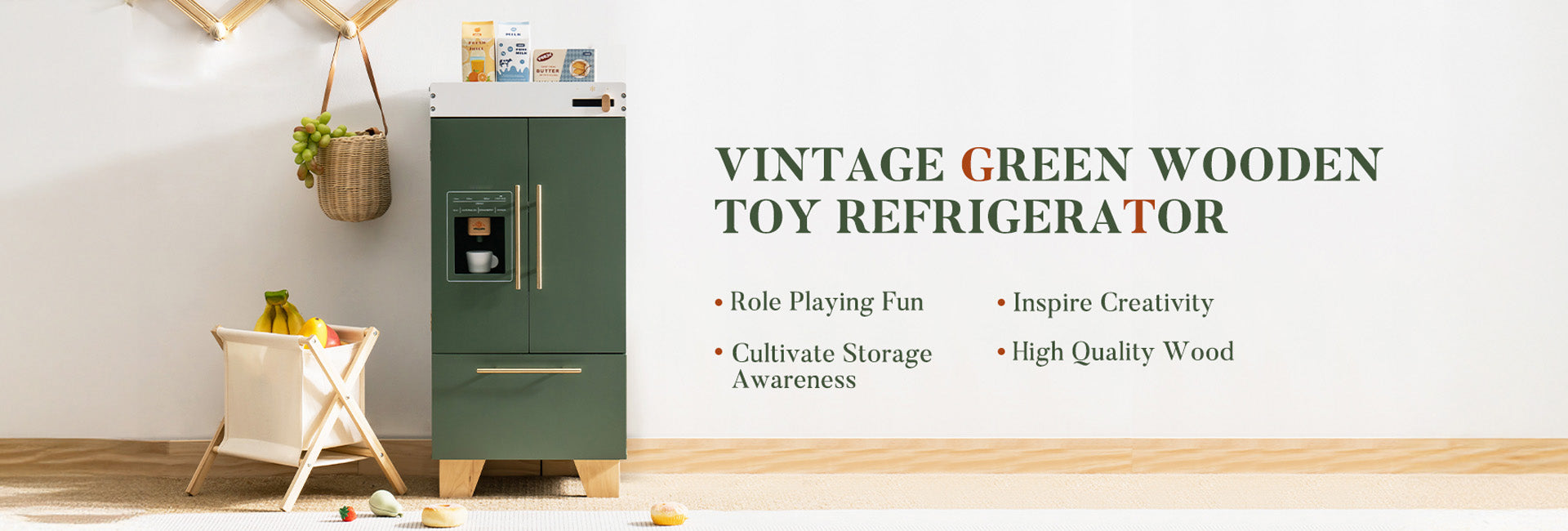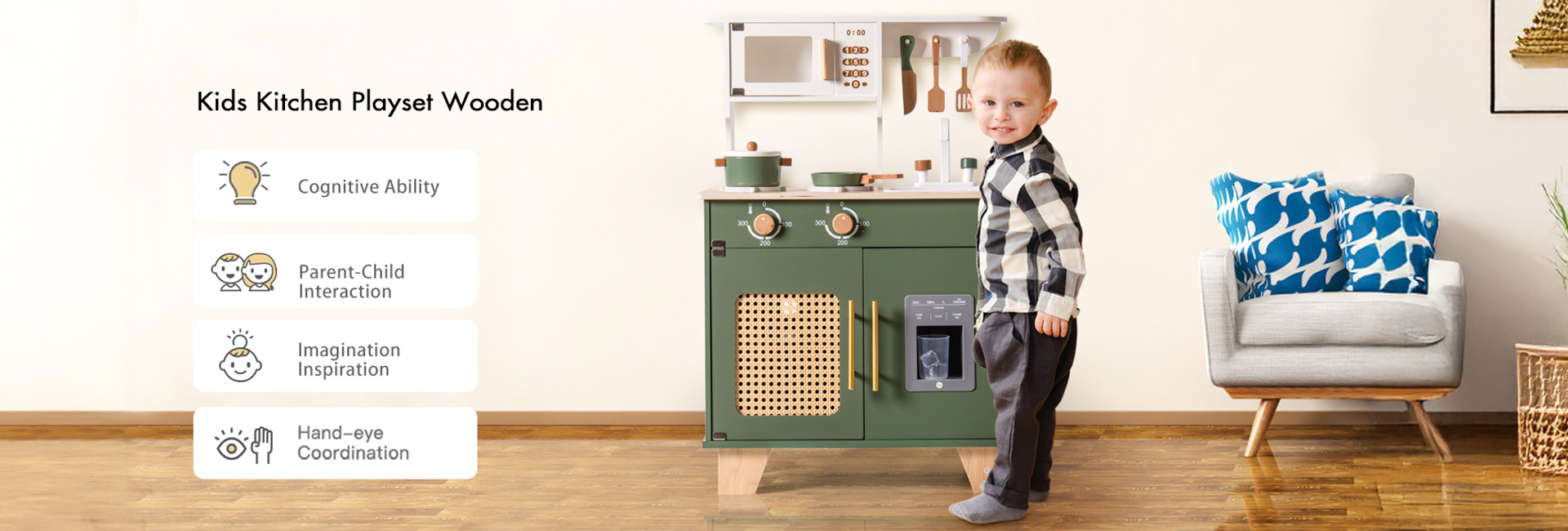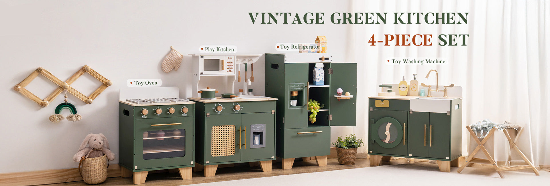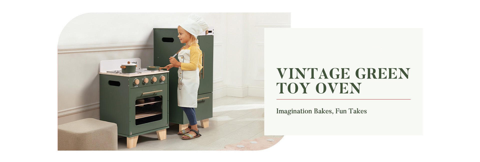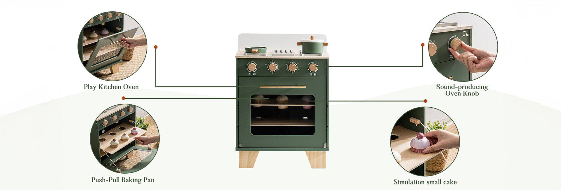 Schaffen Sie mit diesem wunderschön gefertigten Küchenspielzeugset aus grünem Holz im Vintage-Stil ein komplettes Spielküchenerlebnis, das speziell für Rollenspiele für Kleinkinder im Alter von 3–5 Jahren entwickelt wurde.