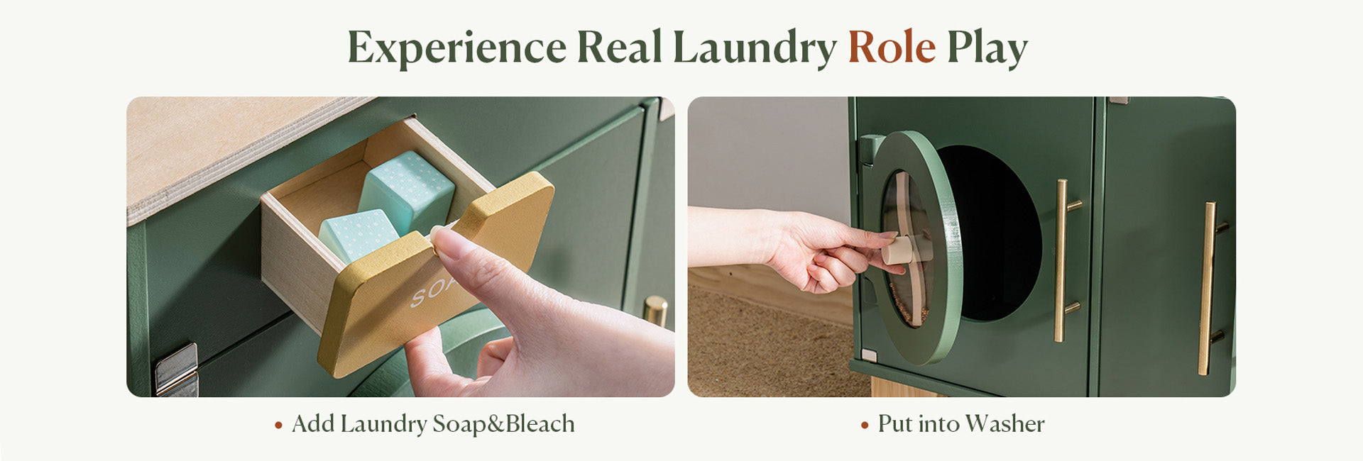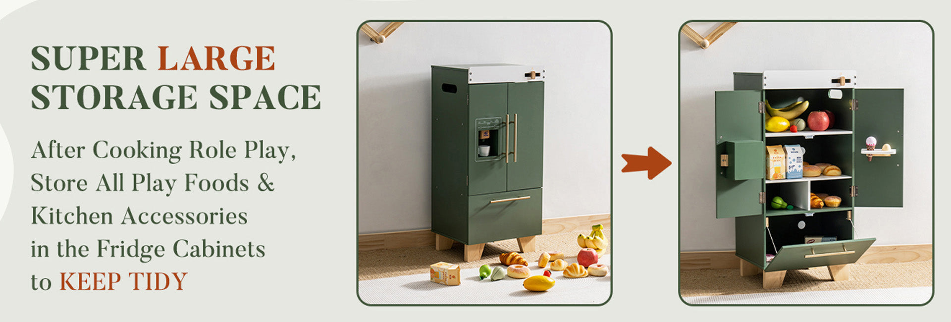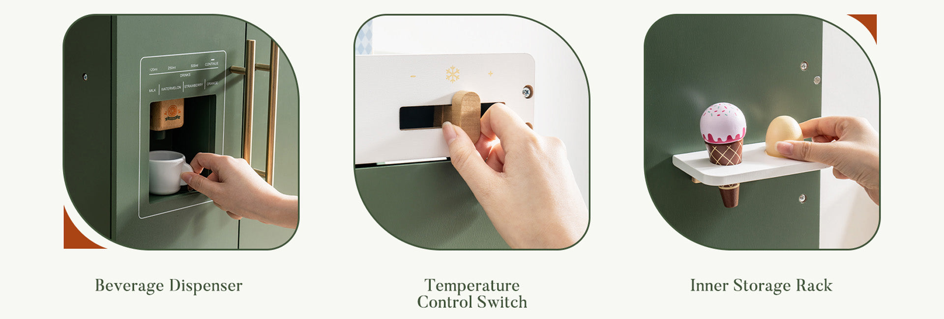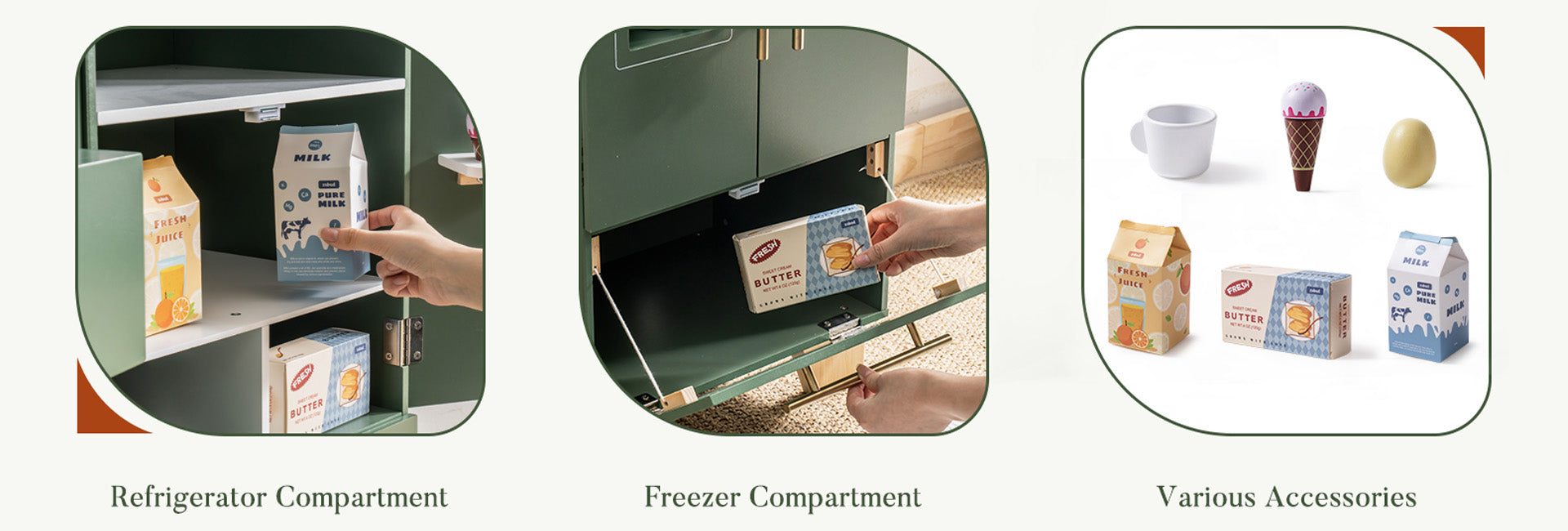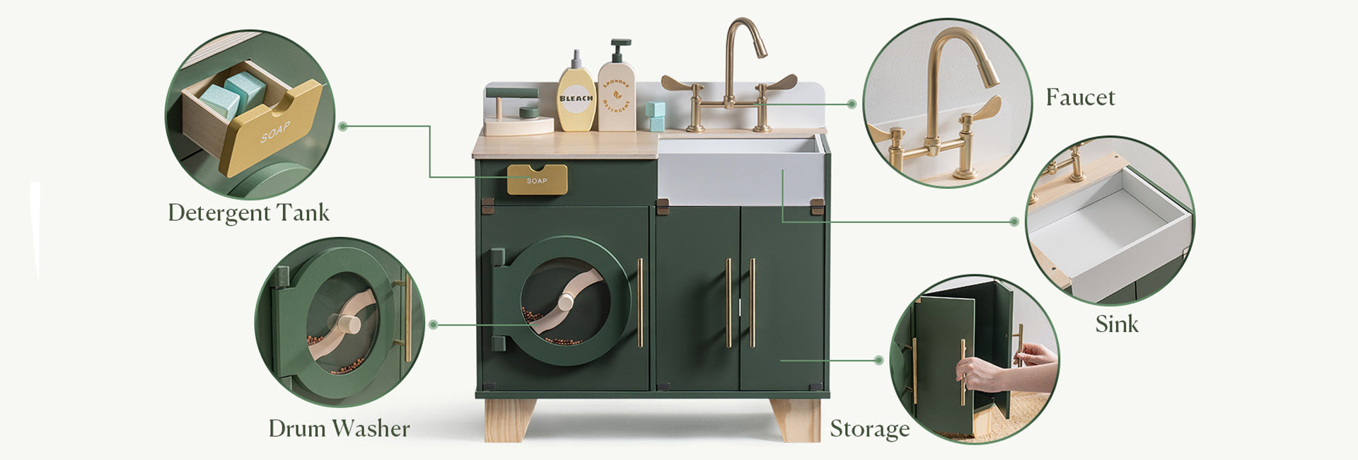 Schaffen Sie mit diesem wunderschön gefertigten Küchenspielzeugset aus grünem Holz im Vintage-Stil ein komplettes Spielküchenerlebnis, das speziell für Rollenspiele für Kleinkinder im Alter von 3–5 Jahren entwickelt wurde.