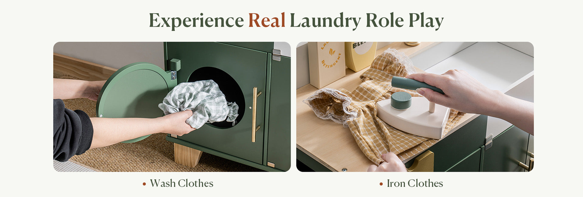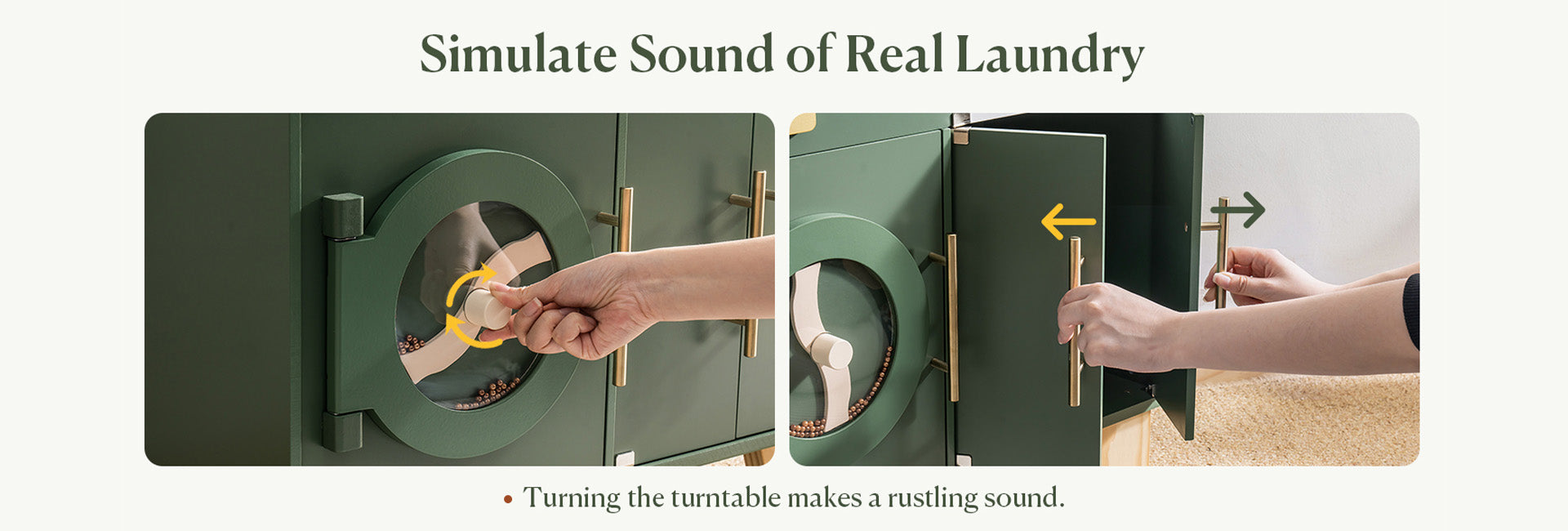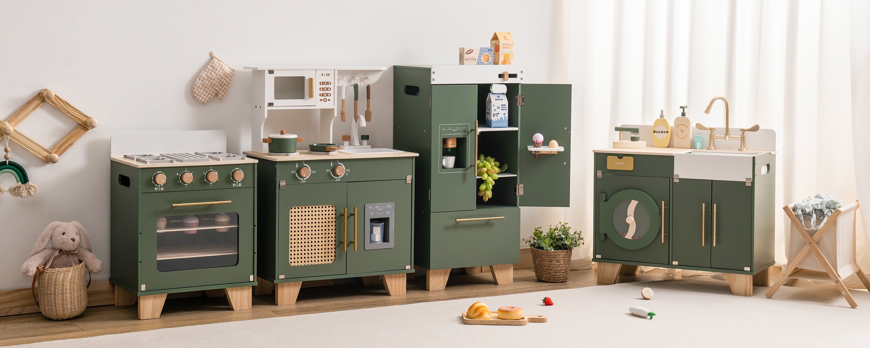 Jedes Bauteil ist aus hochwertigen, kindersicheren Materialien gefertigt und in sanften Vintage-Grüntönen lackiert, die perfekt zu modernen Inneneinrichtungen passen. Das durchdachte Design mit funktionalen Knöpfen, beweglichen Türen und viel Stauraum fördert die Feinmotorik und unterstützt alltägliche Entdeckungsreisen.