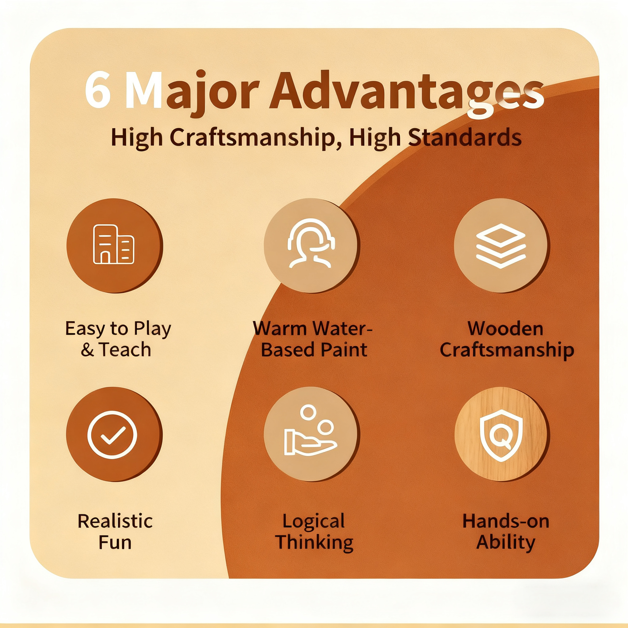 La construction robuste en bois assure la durabilité, tandis que les éléments interactifs, notamment les boutons cliquables et les pièces mobiles, encouragent le jeu d'imitation , la créativité et la narration. La balance, soigneusement conçue, est idéale pour les petites mains et favorise le développement de la motricité fine et de la coordination œil-main .