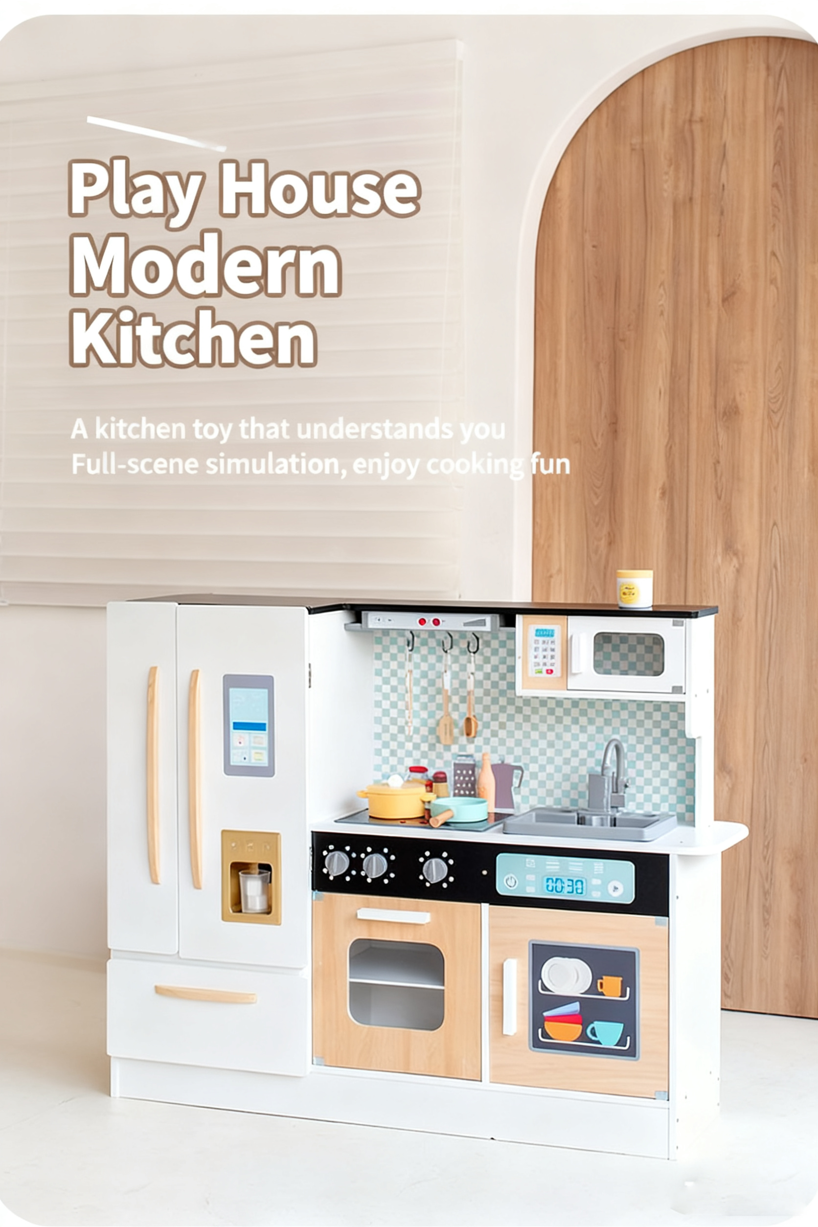 Cette cuisine en bois s'inspire des principes Montessori. Avec des matériaux adaptés aux enfants et des angles arrondis, elle offre un environnement sûr et stimulant pour l'apprentissage des gestes du quotidien comme cuisiner, laver et ranger. Ses couleurs douces et neutres apportent une touche moderne à toute salle de jeux tout en créant une atmosphère ludique et accueillante.