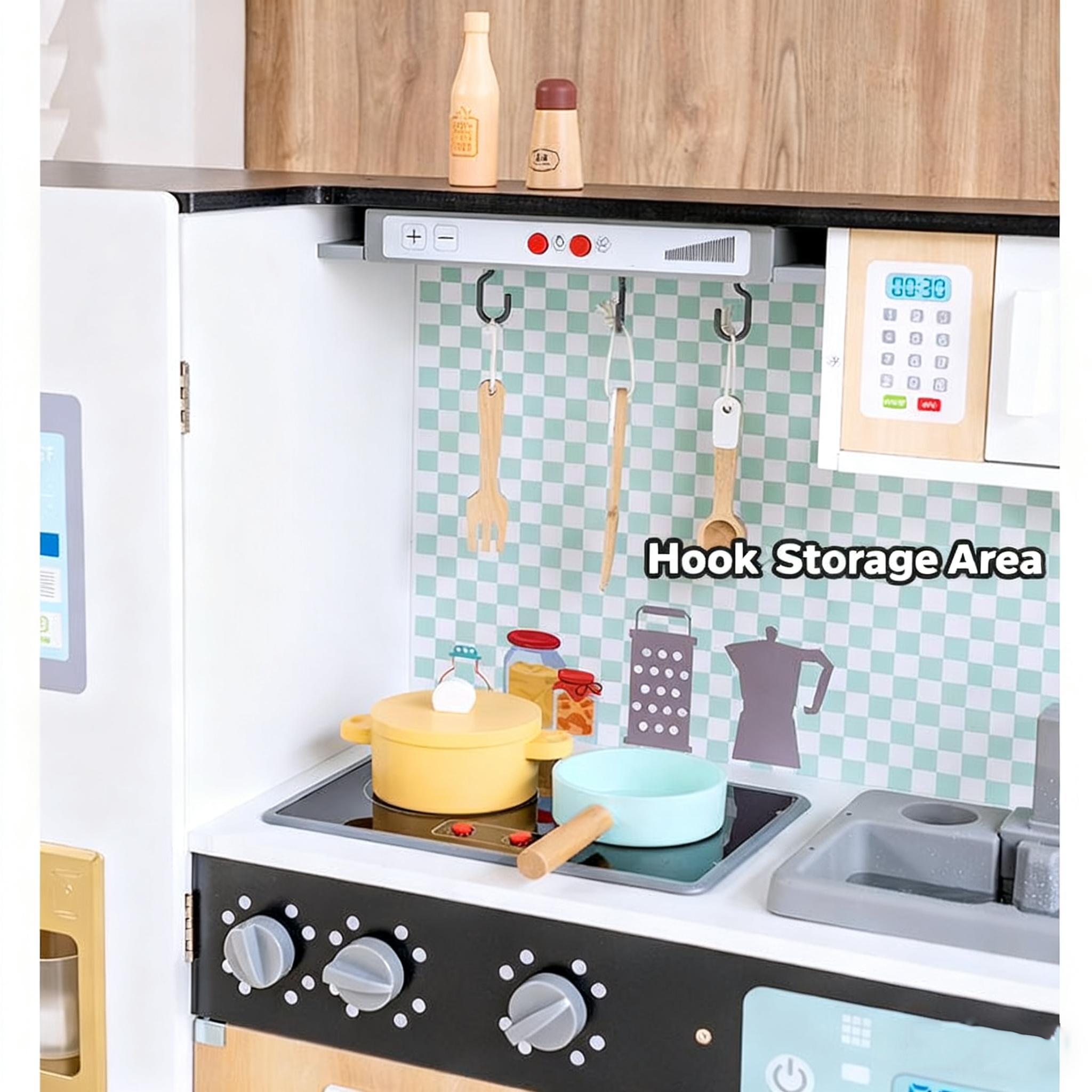 La cuisine ludique Adventure comprend un évier de ferme avec robinet rotatif, permettant aux enfants de faire semblant de faire la lessive et de cuisiner. La porte du four s'ouvre en douceur, révélant un intérieur spacieux pour la pâtisserie et le rôtissage. Les étagères et les crochets ajoutent une touche d'authenticité en offrant un espace de rangement pour les ustensiles et accessoires de jeu.