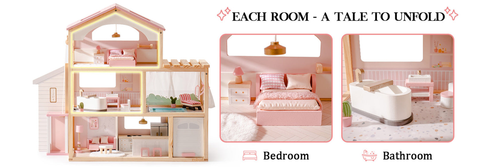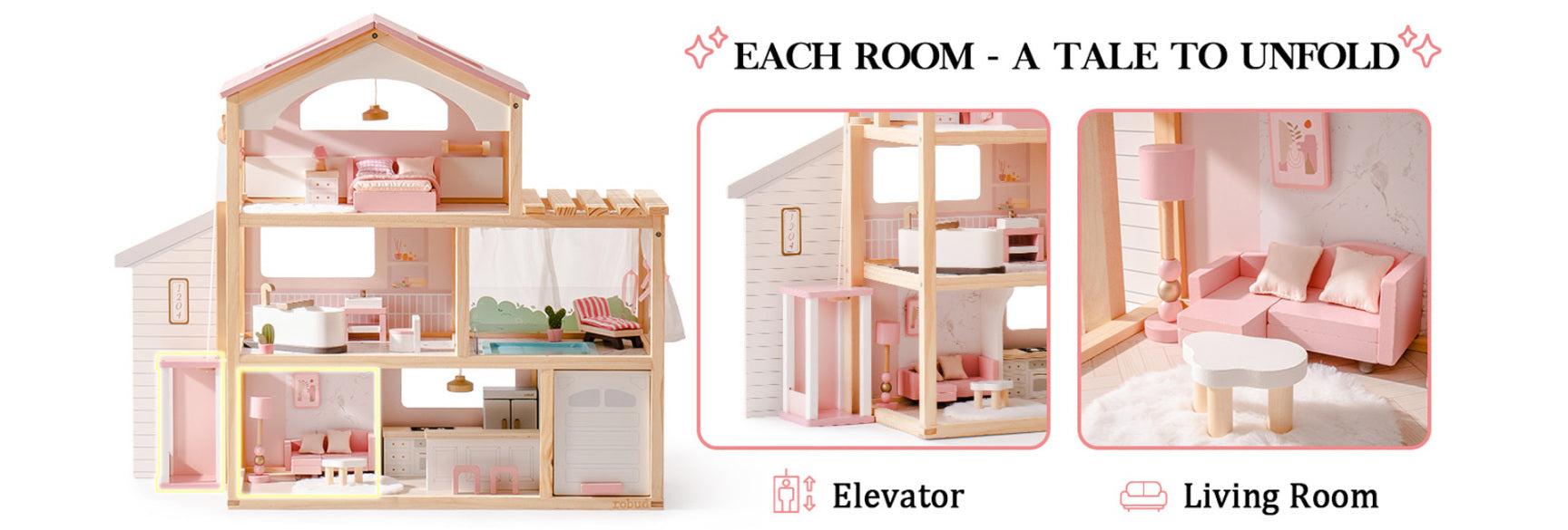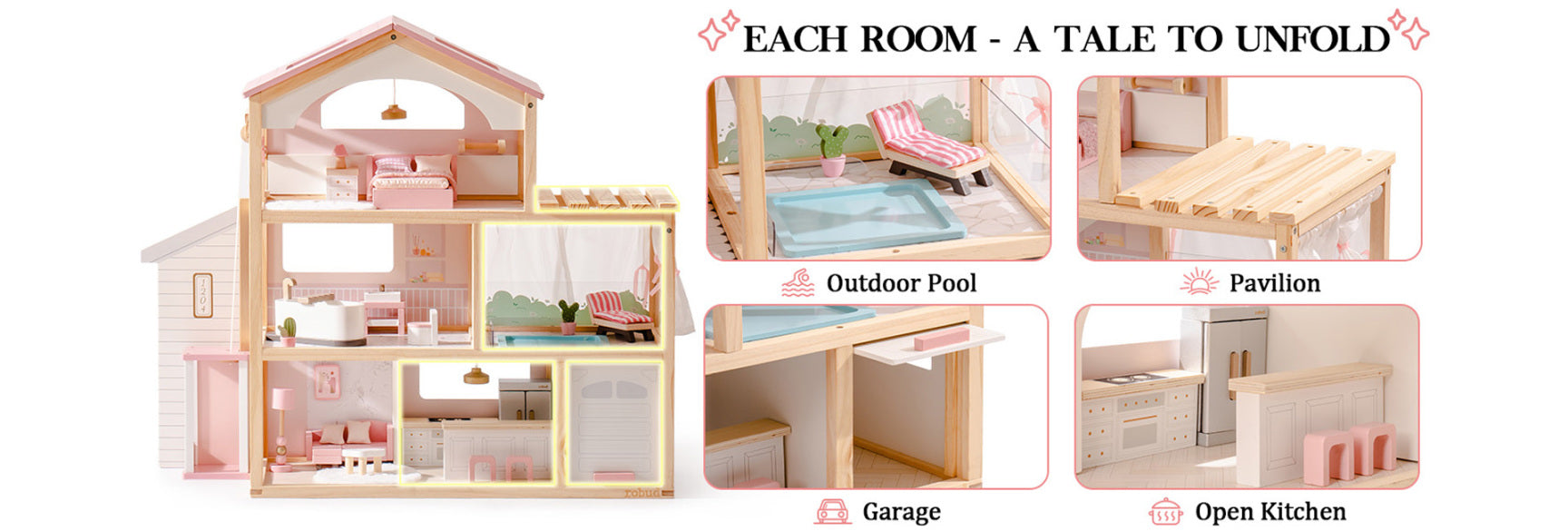 Cette maison de poupée comprend trois niveaux reliés par un ascenseur fonctionnel et offre six pièces distinctes : une chambre confortable, une adorable salle de bain, un salon accueillant, une cuisine ouverte, un espace piscine luxueux et un garage fonctionnel. Chaque pièce met en scène des moments de la vie quotidienne, aidant ainsi les enfants à développer leur imagination et à créer des histoires.