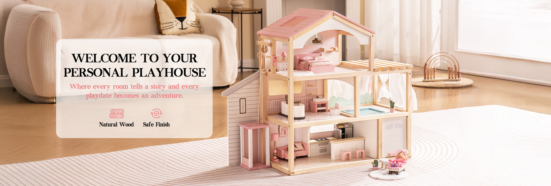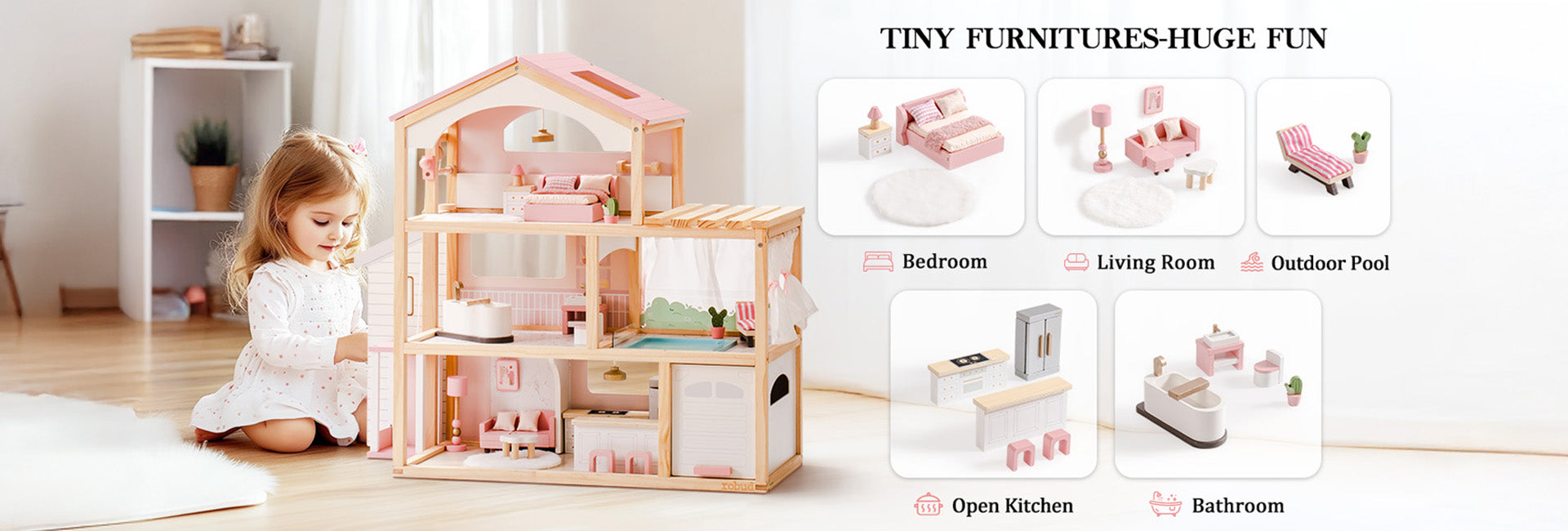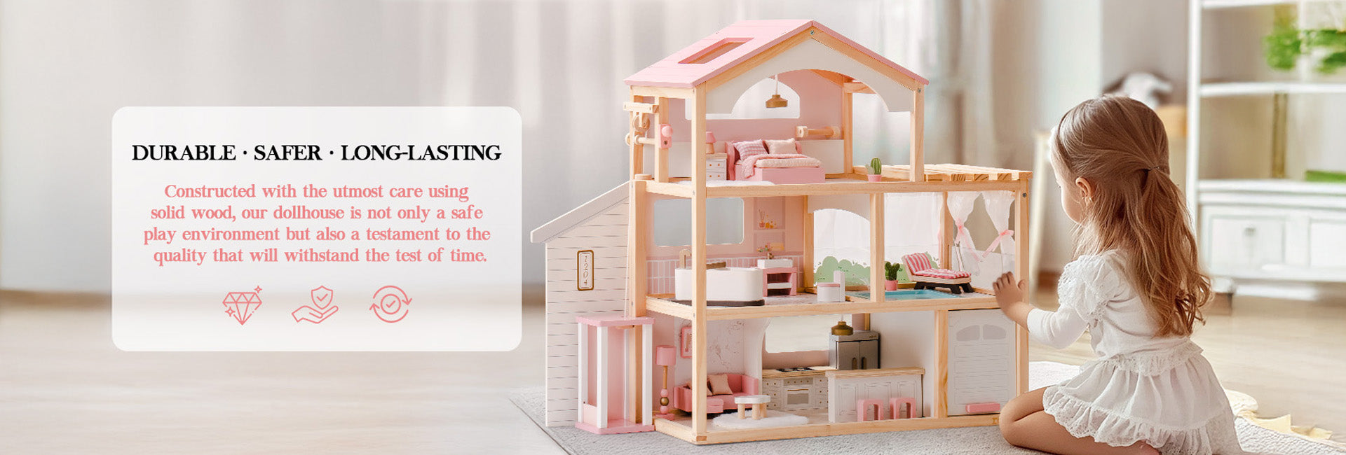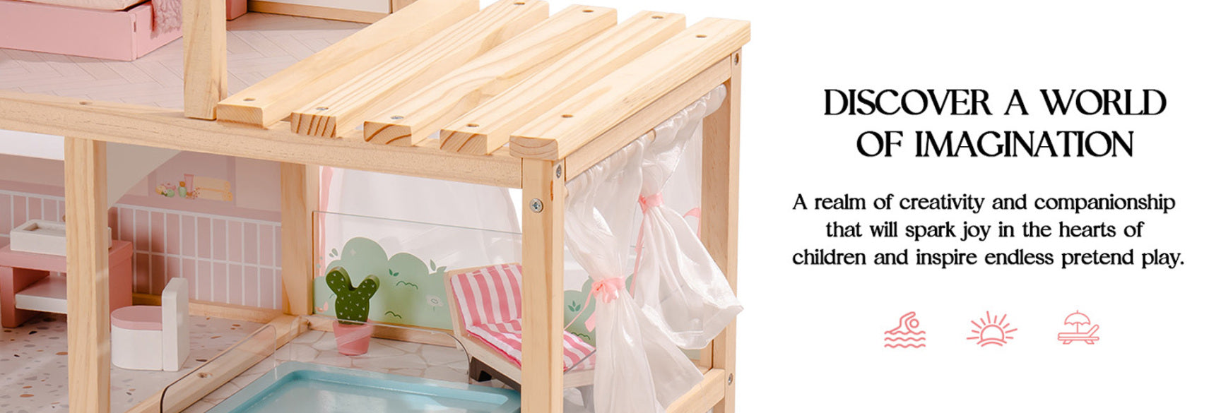 Cette charmante maison de poupée en bois offre aux enfants un espace enchanteur pour laisser libre cours à leur imagination. Avec son toit rose tendre et sa structure en bois naturel, son design allie élégance et simplicité moderne, créant un cocon douillet pour les poupées et un terrain de jeu captivant pour les enfants.