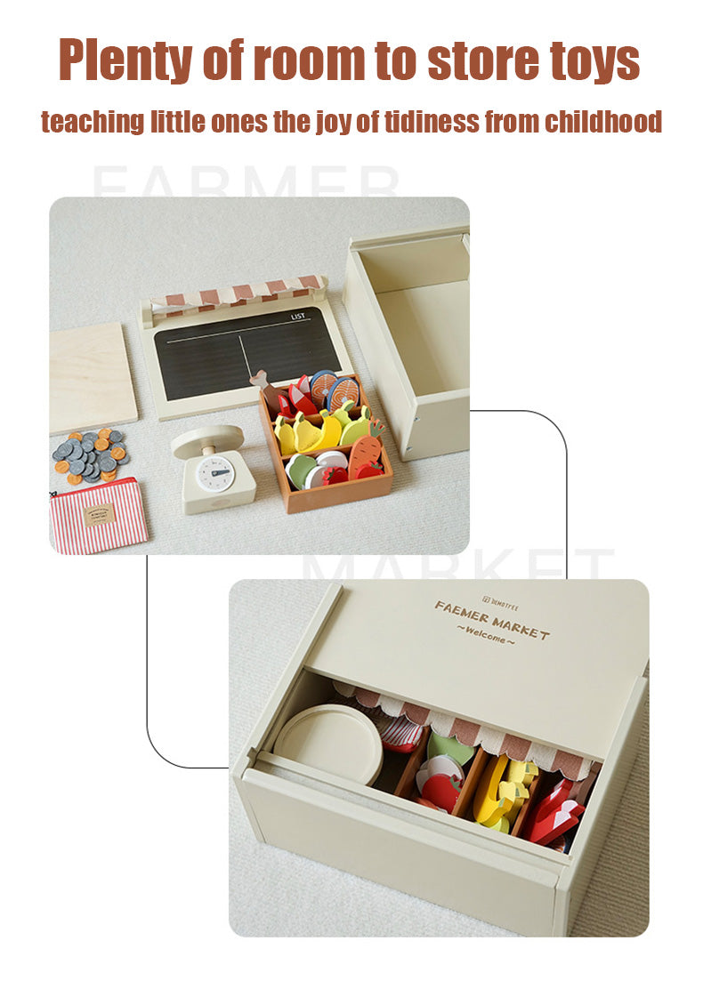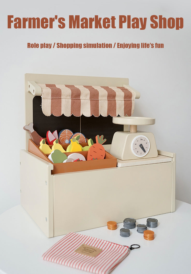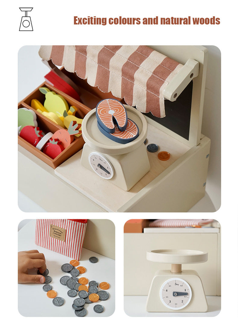 Laissez libre cours à votre imagination avec ce magnifique marché fermier en bois. Conçu pour les petits curieux, ce mini marché comprend des fruits, des légumes et des étagères colorés, parfaits pour que les enfants puissent jouer à faire leurs courses, vendre et explorer des concepts culinaires.