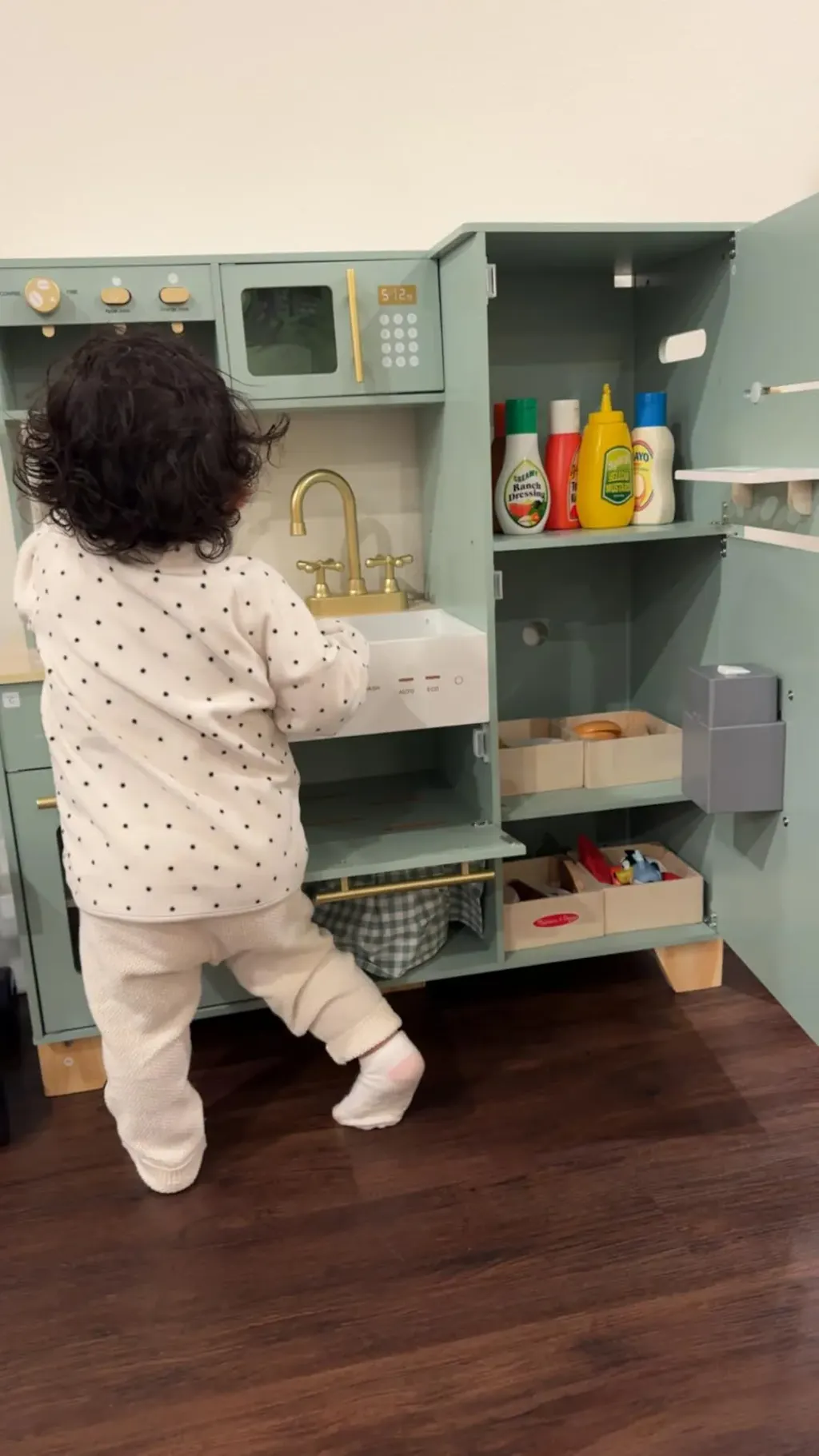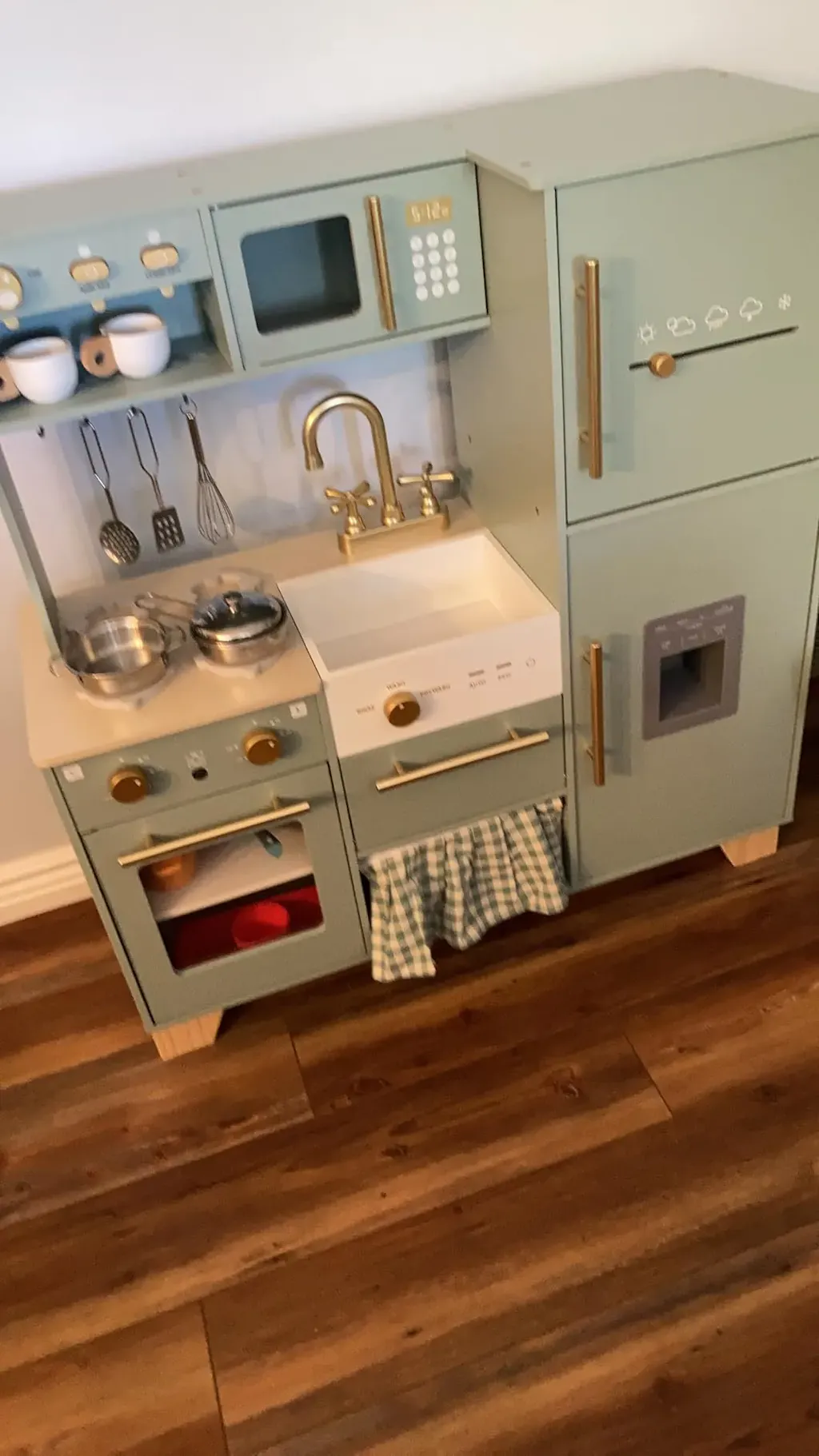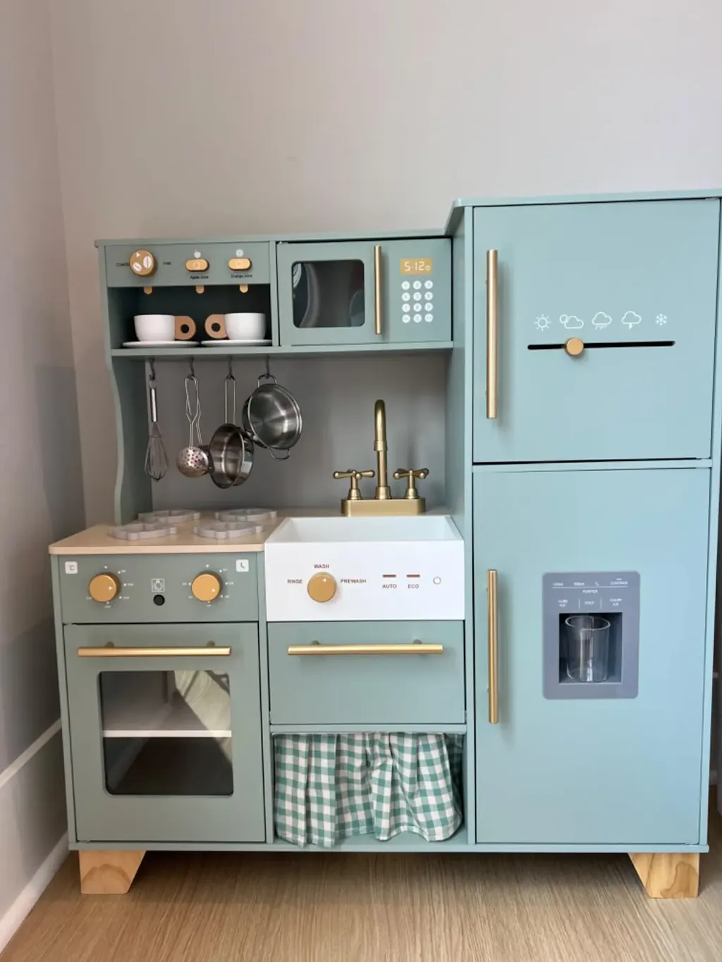 The soft green tone adds a calming, modern feel to any playroom, while the sturdy wooden construction ensures long-lasting fun. With interactive features and scaled-down proportions, it's the perfect setup for young chefs to explore, imagine, and express themselves through creative cooking stories.