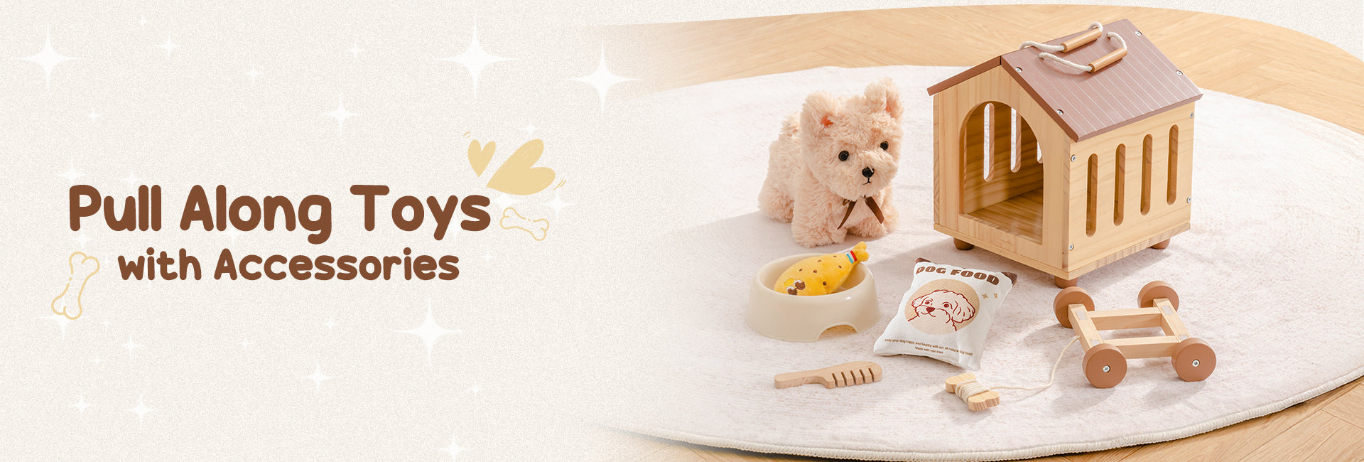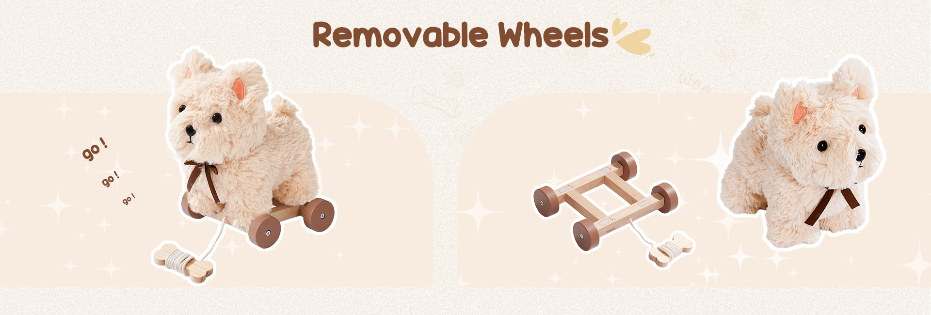 Oh my goodness! This adorable pull-together puppy toy has a cute plush body mounted on wooden wheels, making it easy for kids to take their dog anywhere. The soft fur and cute design provide comfort and companionship. Even when parents are not at home, children will have a playmate and spiritual comfort