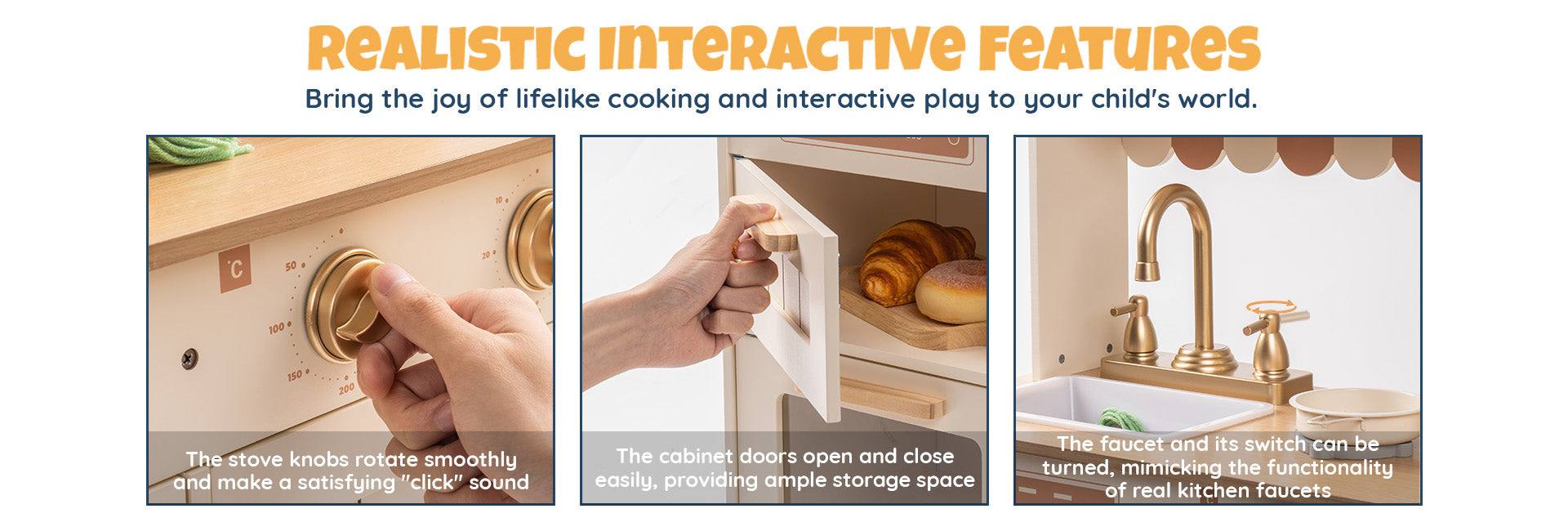 Featuring lifelike components such as a stovetop, sink, oven, and storage cabinets, this set offers a complete and immersive cooking experience. The clickable knobs, openable doors, and rotating dials allow little hands to explore and mimic real-life kitchen activities.
