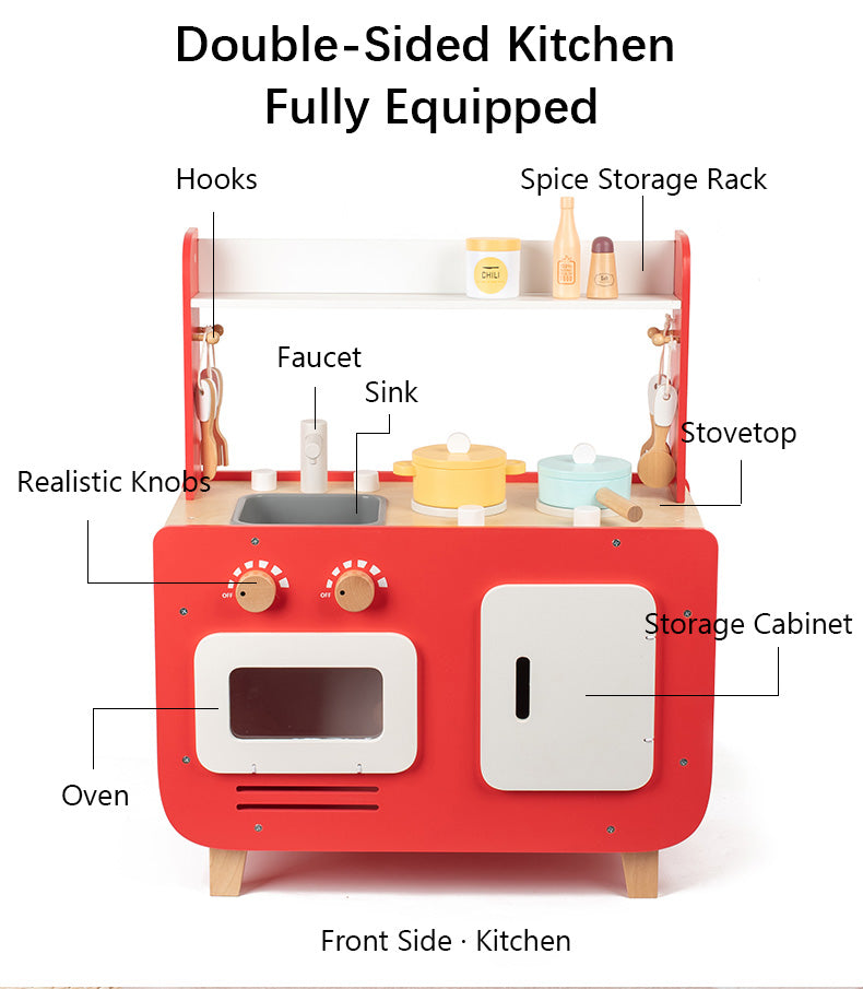 The Double-Sided Wooden Kitchen & Laundry Playset combines a full kitchen and washing station in one compact design.