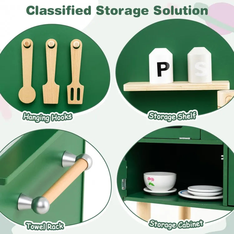 This pretend kitchen encourages hands-on learning and supports Montessori principles, helping toddlers and preschoolers develop fine motor skills, imagination, confidence, social sharing and language expression. Ideal for children who love themed play, wooden toys, pretend food and early learning environments.