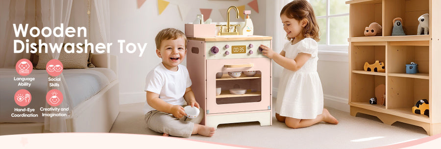 Crafted from durable wood with a pastel pink finish, this dishwasher not only looks stylish but also promotes hands-on learning. It encourages role play, helping toddlers develop creativity, responsibility, and confidence. Parents love how this toy supports independent play while enhancing social interaction when shared with friends.